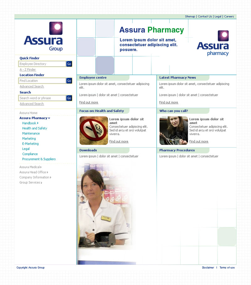 Concept ideas for Assura Group intranet. Route 1 - main portal page. Assura Group branding and global searches for employee directory, location finder and search the site sitting at the top of the screen. Horizontal navigation. Three column grid. Colours and imagery reflect Assura Group branding guidelines.