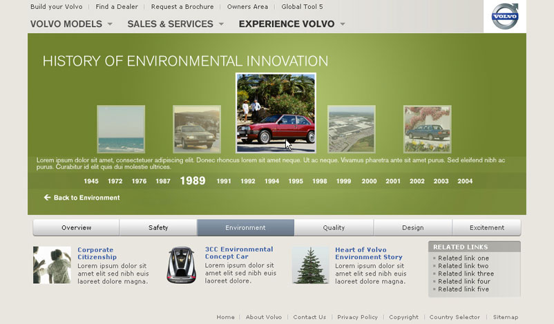 The 'Experience Volvo' section was revised in great detail with new copy, interactive galleries, videos and imagery. The objective was to increase the understanding of the Volvo philosophy.