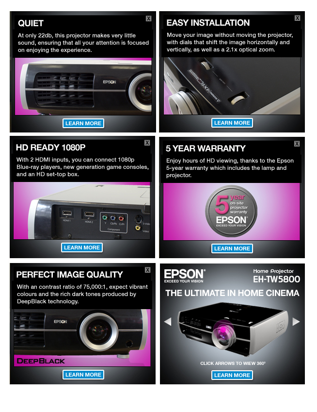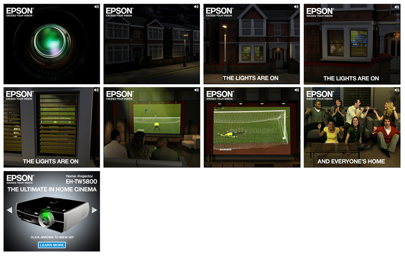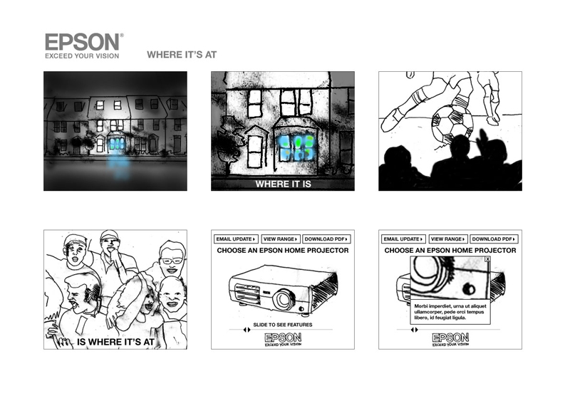 Interactive banner and micro site campaign to promote Epson’s home projector range. The concept surrounded the theme that staying in was the new going out. The street pan and interiors were created using 3D with studio shots of the crowd superimposed.